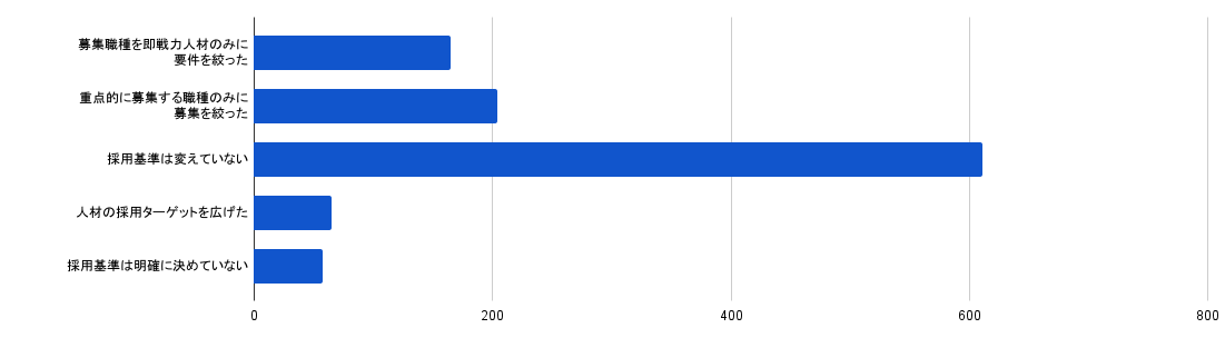 また、「即戦力人材のみに絞った」「重点的に募集する職種のみに絞った」の回答も一定数あり、「採用コストの見直しにより、ターゲットの幅が狭まっている」「事業の先行きが不透明な中で、育成を前提とする採用は優先度が下がっている」といった回答も見られました。